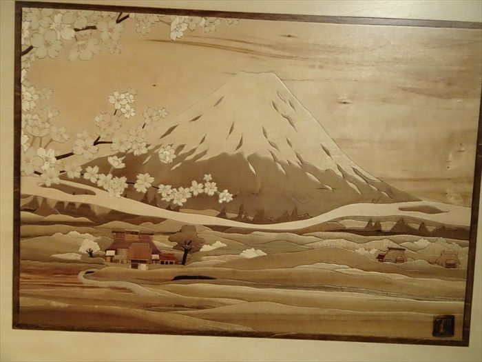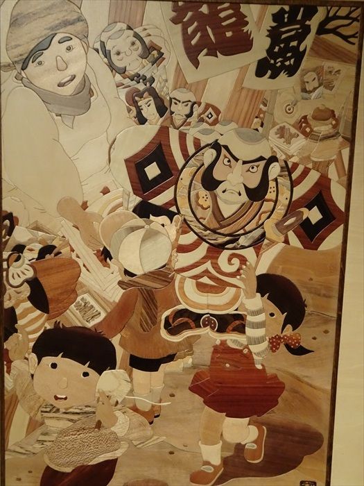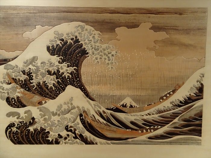 半年以上かかったそうだ。また富士に降る雪のような波しぶきの部分は、糸鋸で丸く切った木を