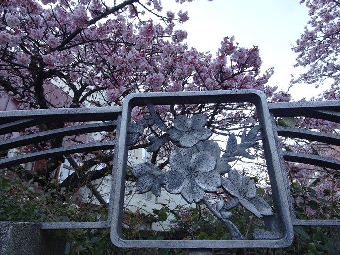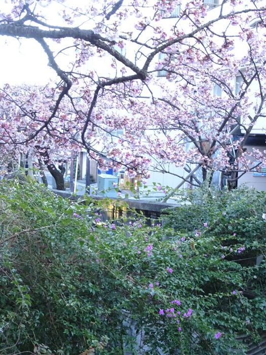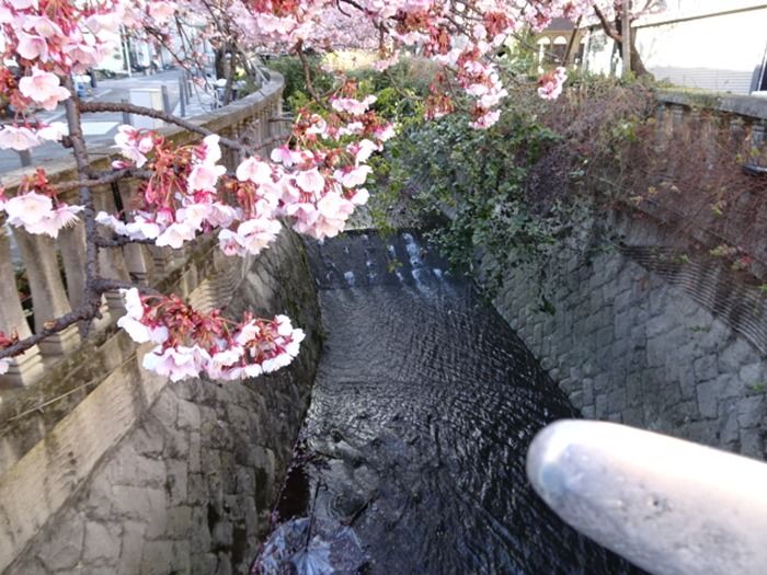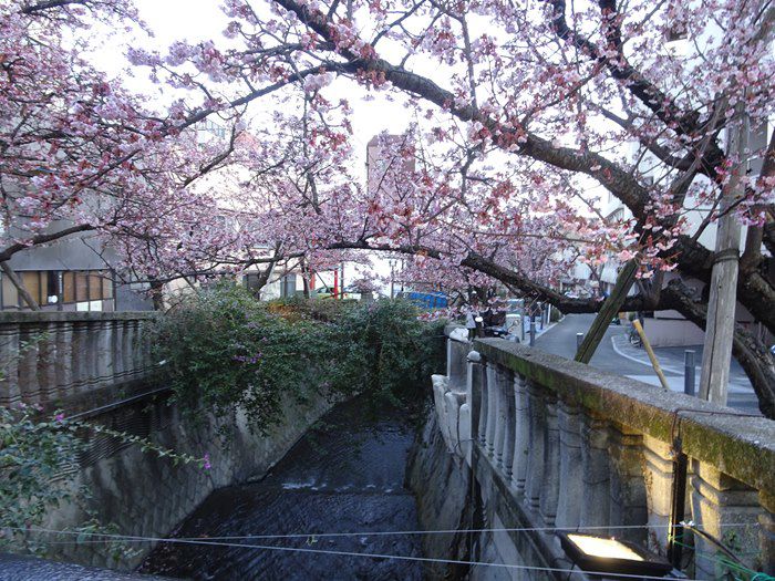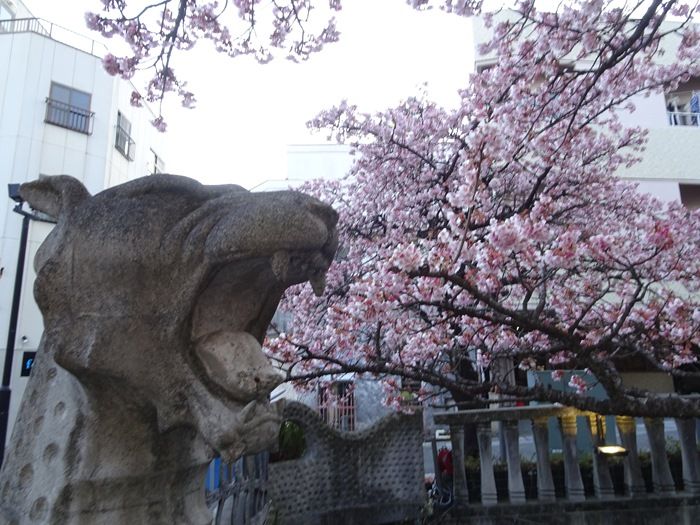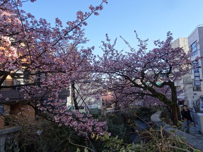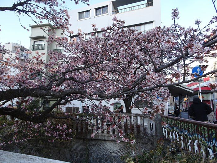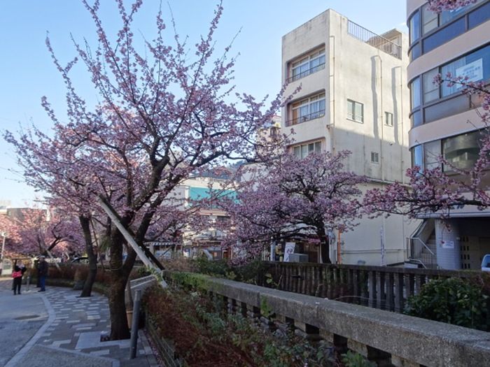 熱海市内中心部を流れる糸川は、川沿い300m程の糸川遊歩道に早咲きの「あたみ桜」が