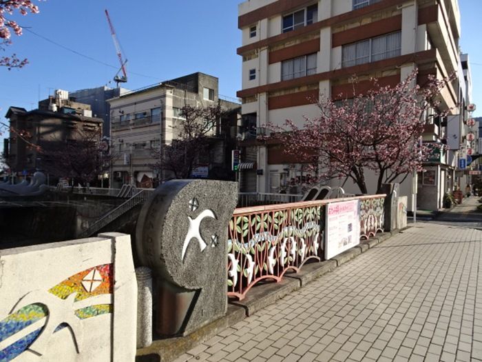 その間、御成橋 → 新柳橋 → ドラゴン橋 → 桜橋 → 糸川橋 → 柳橋 → 渚橋 と糸川に架かる橋を