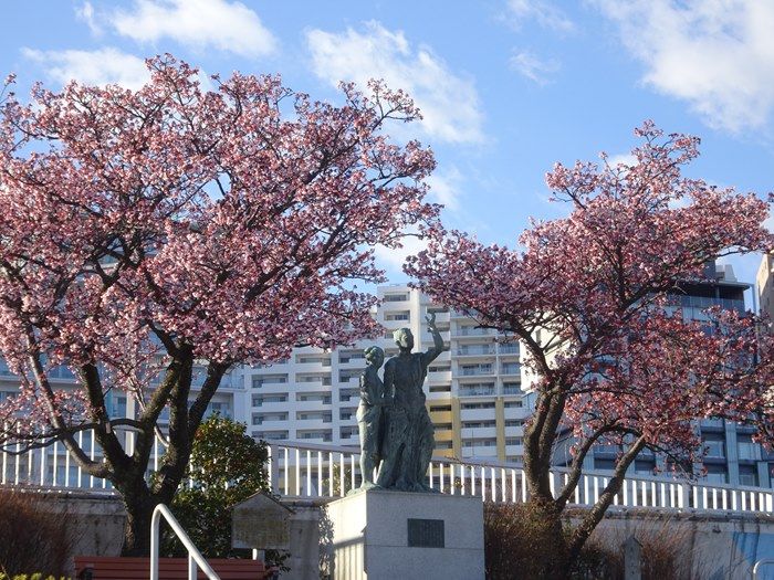「あたみ桜」と釜鳴屋平七夫婦像。