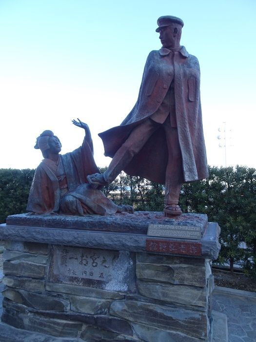 上半身ハダカでマゲがゆってある男性と彼に寄り添う女性の銅像。