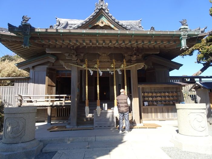 葉山マリーナから県道207号・森戸海岸線を進み右に曲がると森戸神社に到着。