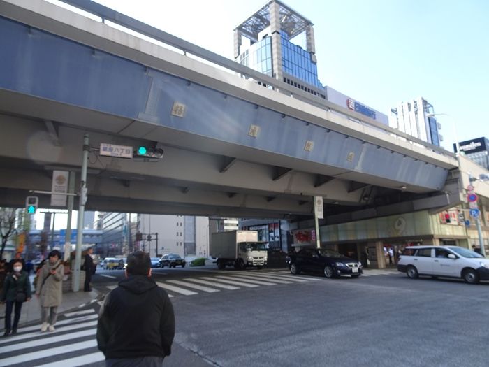 「銀座八丁目交差点」。上部に首都高速が。