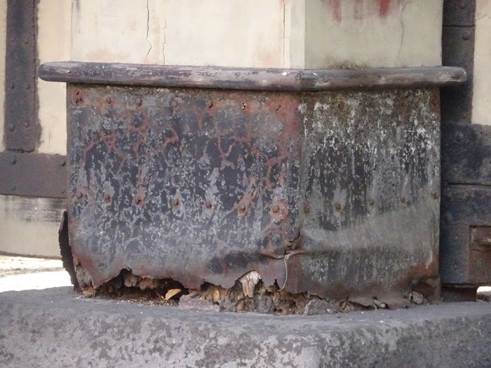 御成門の柱の下部の保護板は酷く腐食され、早急の補修が必要。