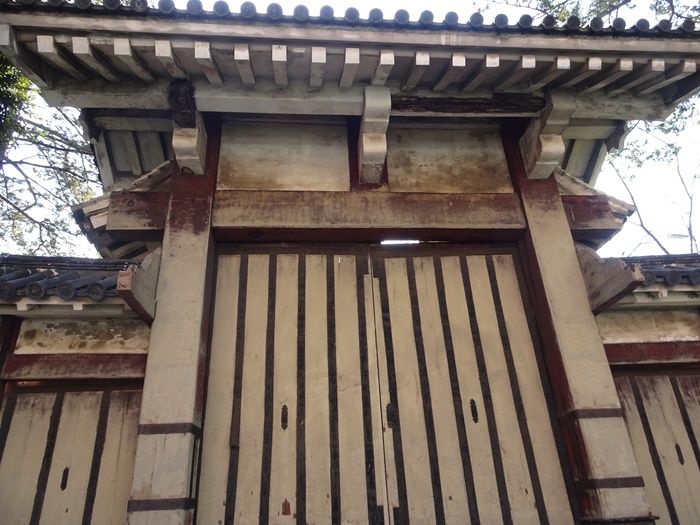 枡形(ますがた)に入って右に曲ると、渡櫓(わたりやぐら)があって堅固な門扉が設けられて