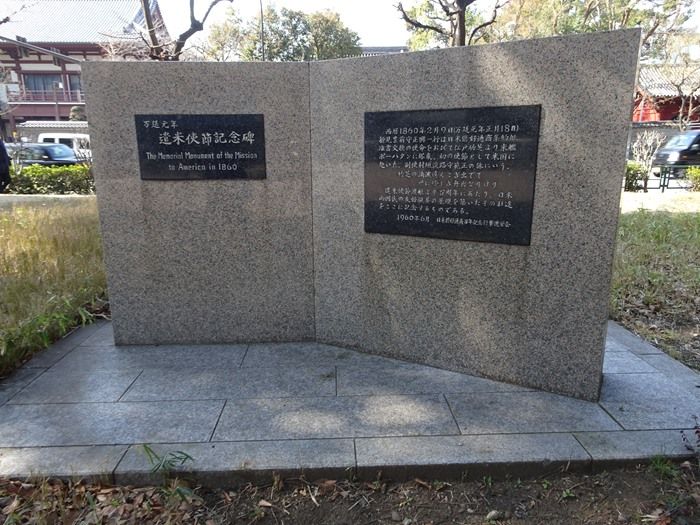 「万延元年 遣米使節記念碑」。