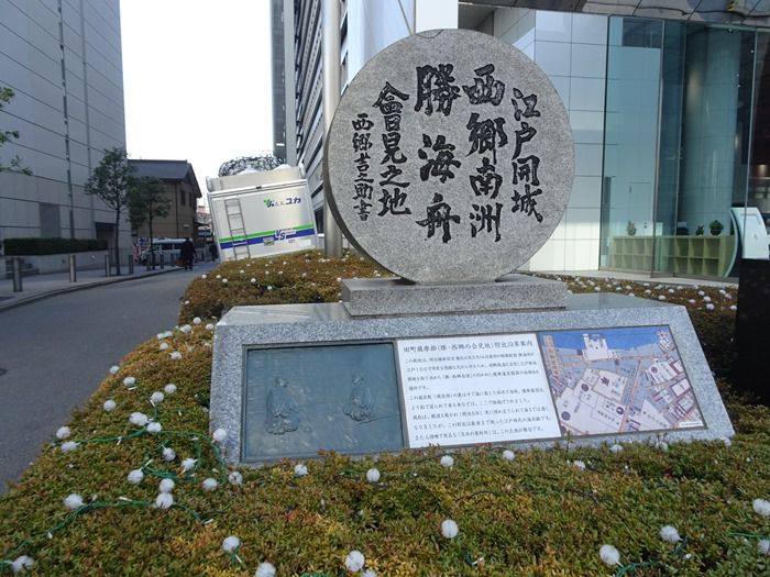 三菱自動車工業(株) 本社前に「江戸開城 西郷南州・勝海舟会見之地」碑が。