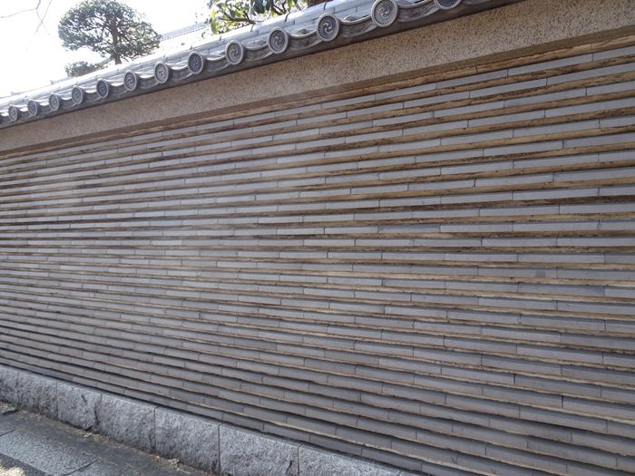 土と石灰を油で練り固め、瓦を厚く積み重ね、上部を桟瓦で葺いた築地塀。