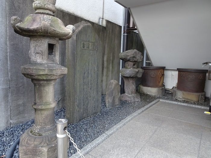 建物の左の壁には石灯籠や石碑が並んでいた。ここも境内の一部。