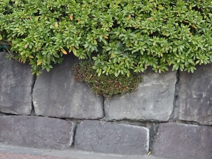 ものと考えられます。正面の小ぶりの石が積み直されたものです。3段目から下の石垣は現地で