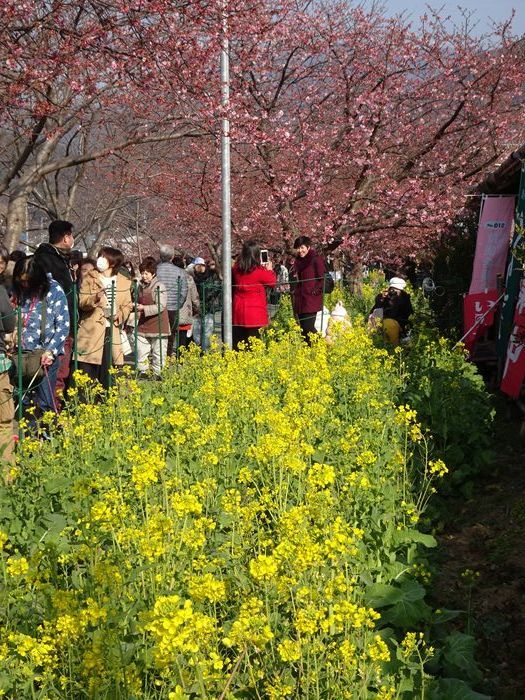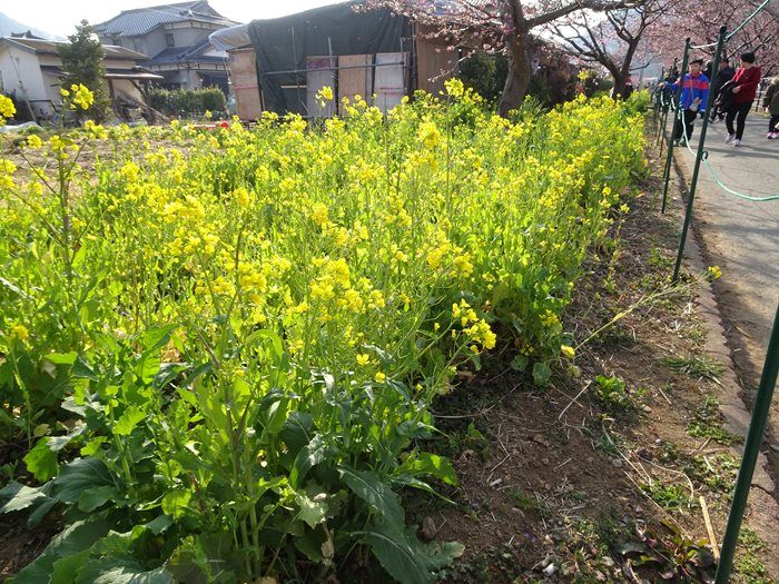 河津川の堤の道沿いの菜の花はほぼ満開に。