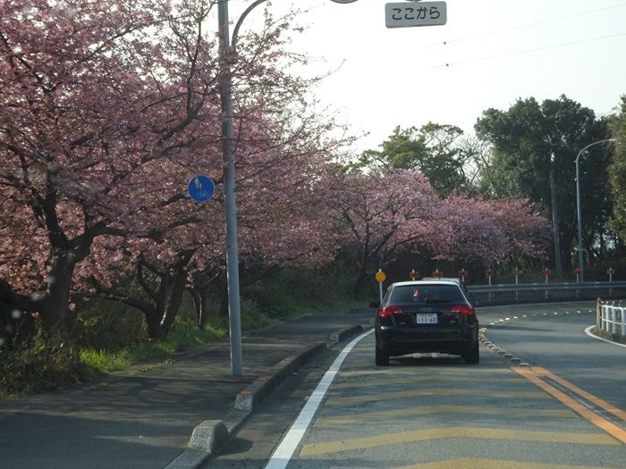 河津町に近づくにつれて、道路脇に河津桜の花が。