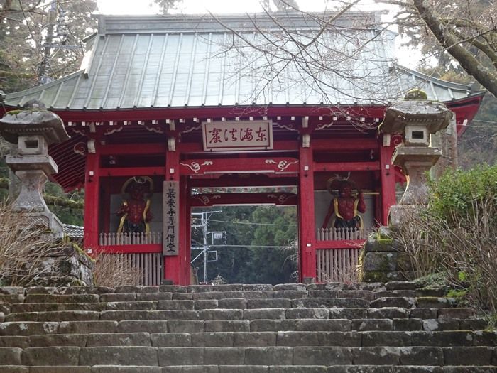参道の3丁目に位置する、朱色の門「東海法窟」の額と「最乗寺専門僧堂」と書かれた