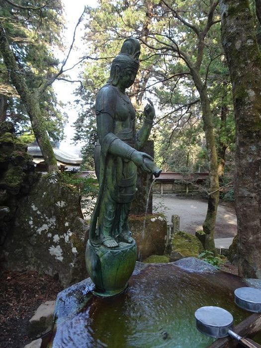 納札所前の手水場で心静かに佇む観音様。