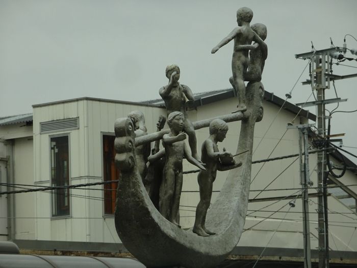 駅前広場にあるオブジェ。9時・12時・15時・18時になると音楽が鳴り、オブジェが左右に揺れると。