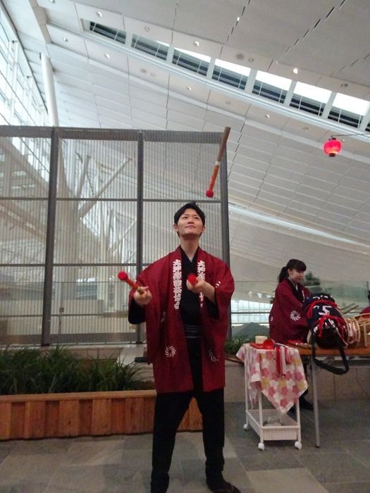 お祭り広場ステージにて曲芸のパフォーマンスを楽しむ。