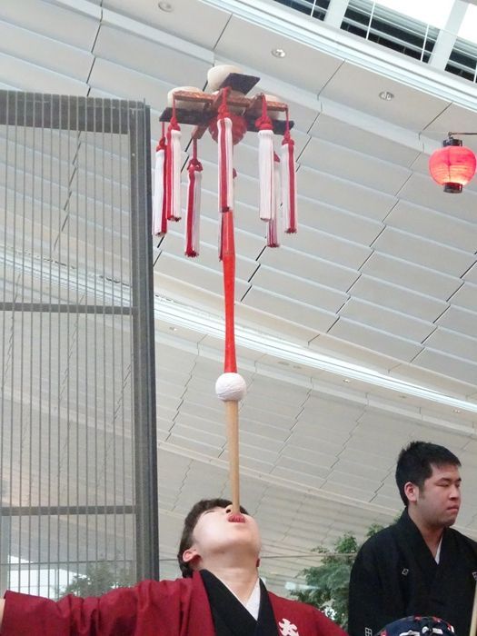 口で支えた棒の先に茶碗を立てる"五階茶碗顎"などの日本古来の太神楽曲芸も鑑賞。