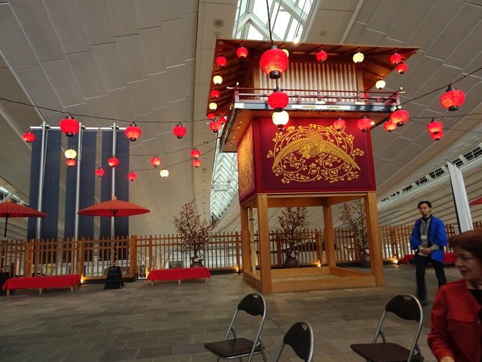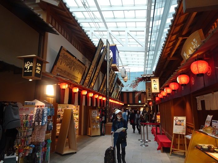 江戸舞台の左側に歌舞伎演技場風の店舗が並ぶ。