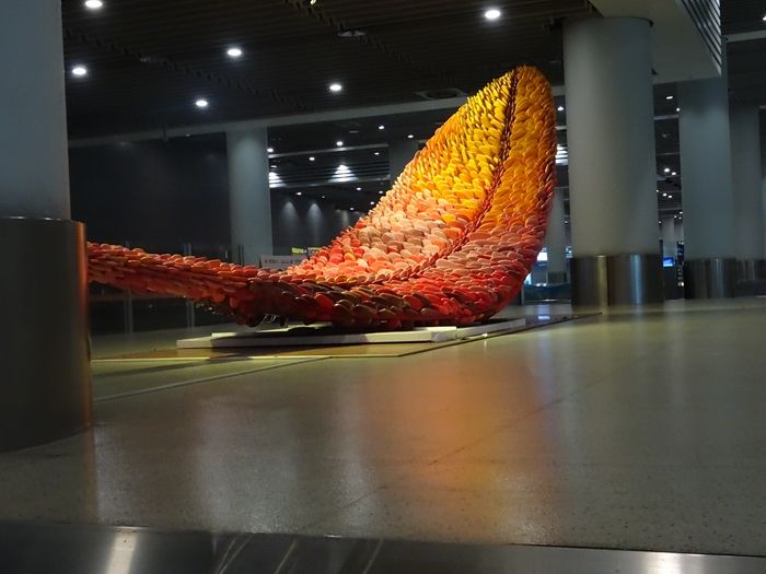 荷物の受取り場所には、紅葉した巨大な木の葉の如きモニュメントが。