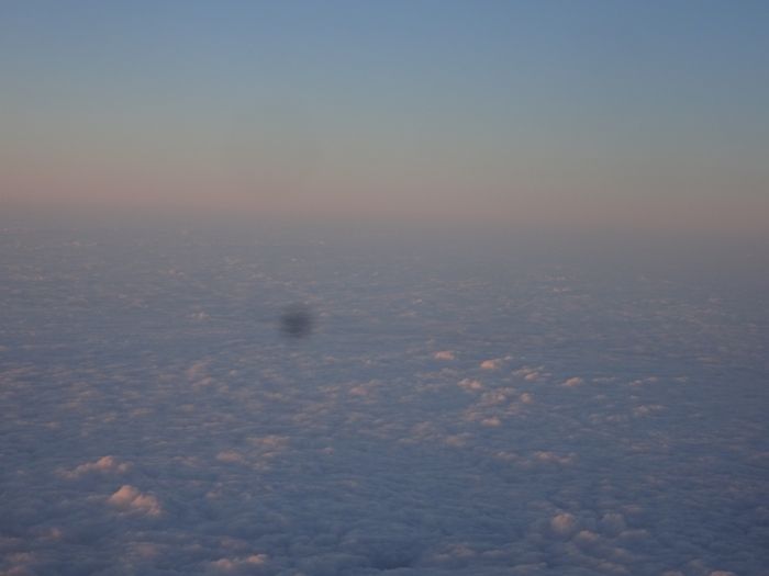 離陸すると、機窓からほのかな夕焼けが。