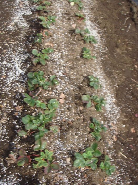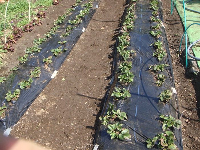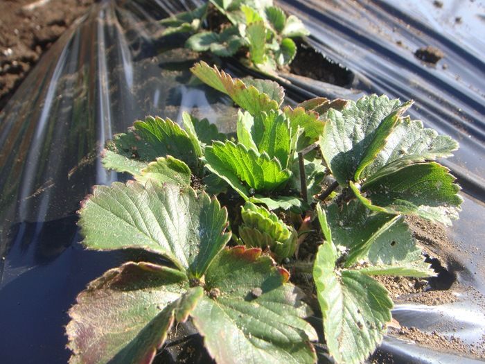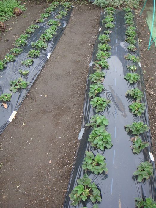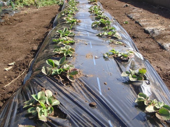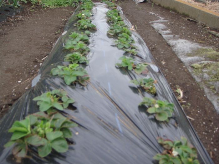 イチゴは寒さに当てることで花芽が分化するので、冬越ししたあとからマルチをかけるという、