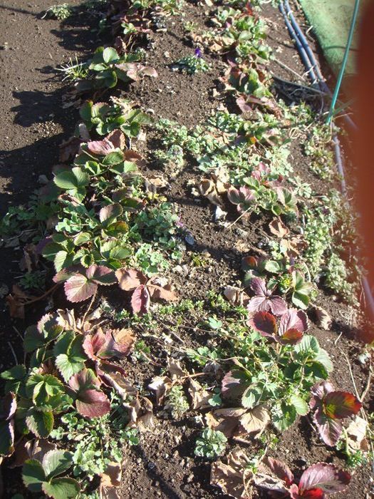 雑草、イチゴの葉の色が茶変したもの、枯葉を取り除きました。