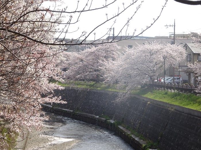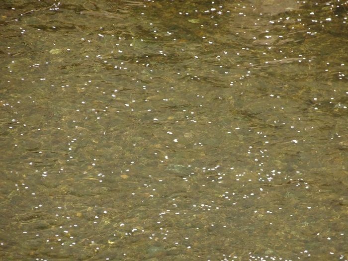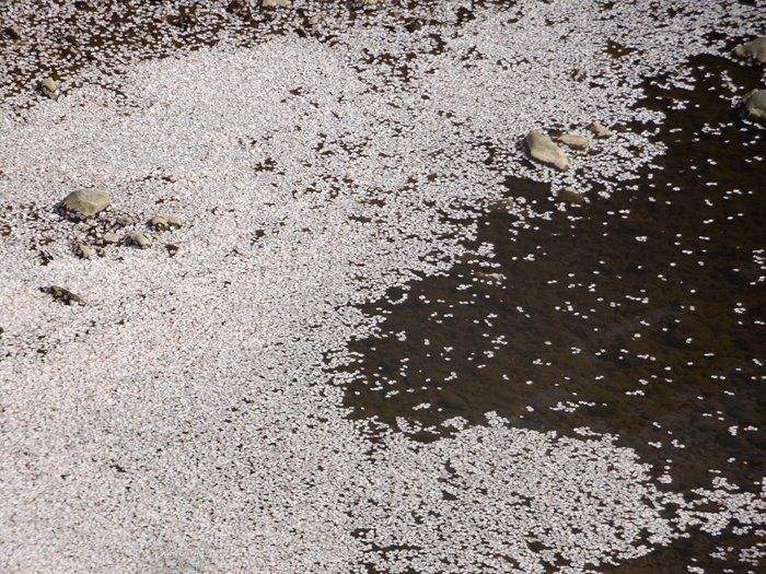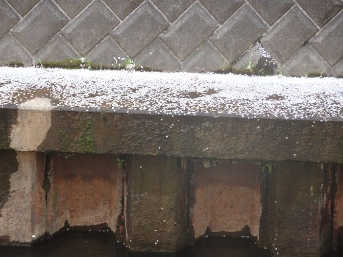 川面の淀み部分には花片が。
