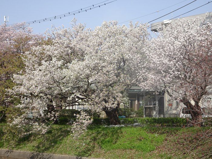 川の反対側には白いオオシマザクラが。