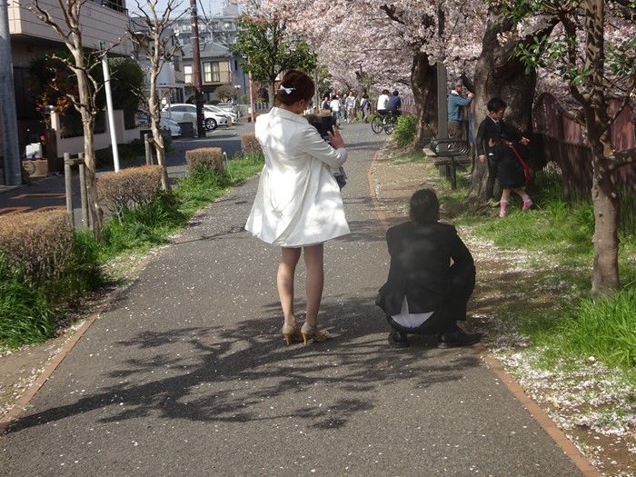桜並木には下校する女子学生の姿も。