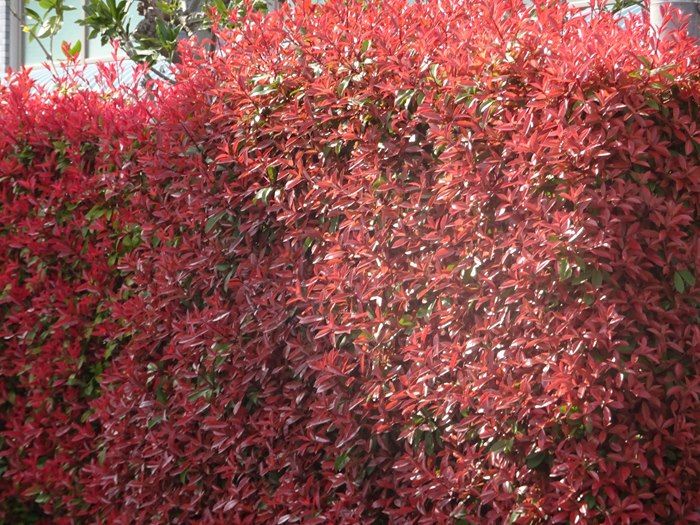民家の生け垣には紅カナメモチの赤い新葉が。