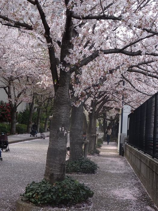 校庭内の桜並木は花吹雪が激しく。