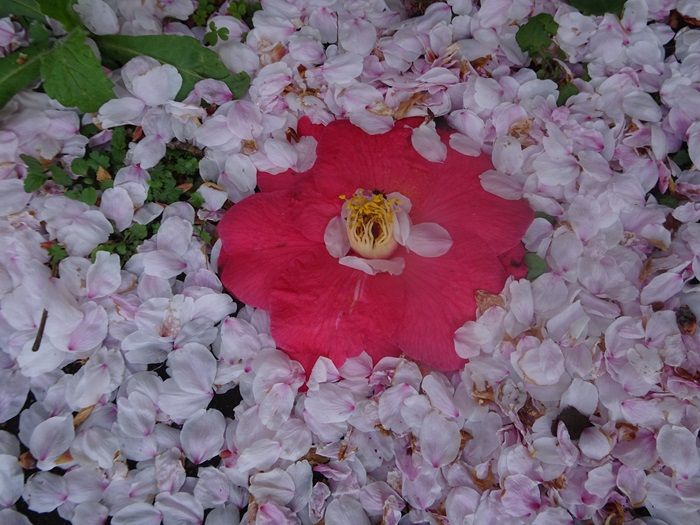 桜の花びらに座る赤い椿の花。