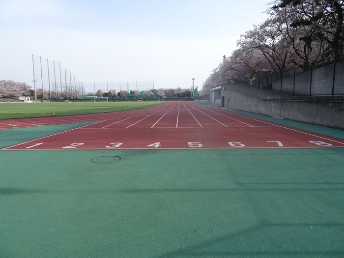 競技場トラックの100mのスタート地点から。