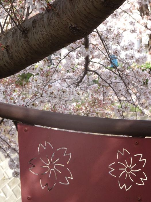 堤防沿いの手摺りには桜の花片が切り込まれていた。