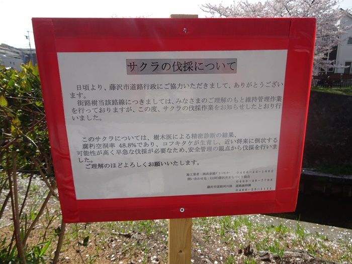「サクラの伐採について」の説明板。