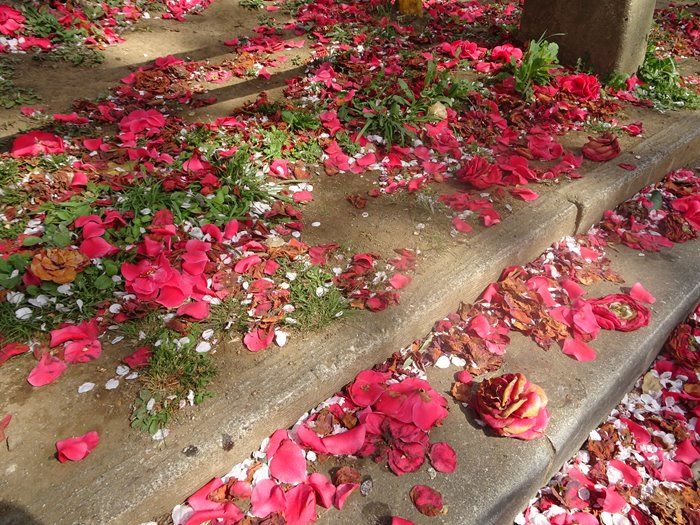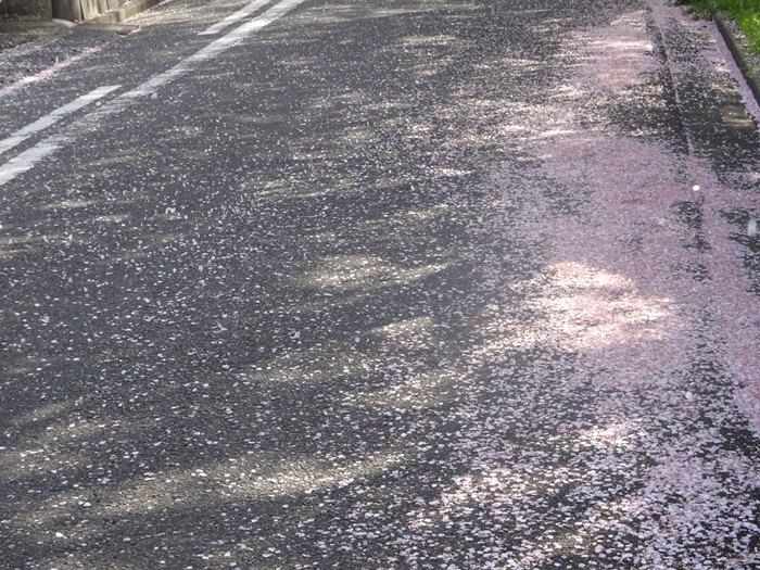 道路の脇にもピンクの花片が。