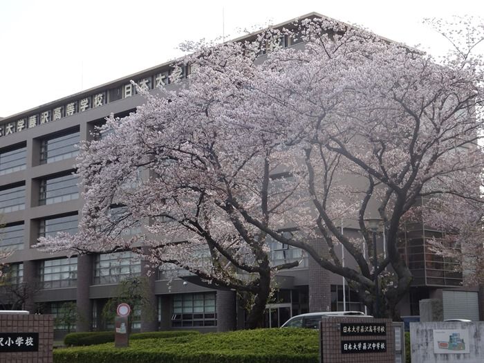 小、中、高の一貫教育の学び舎の正門の桜。