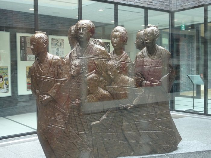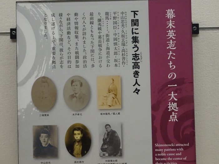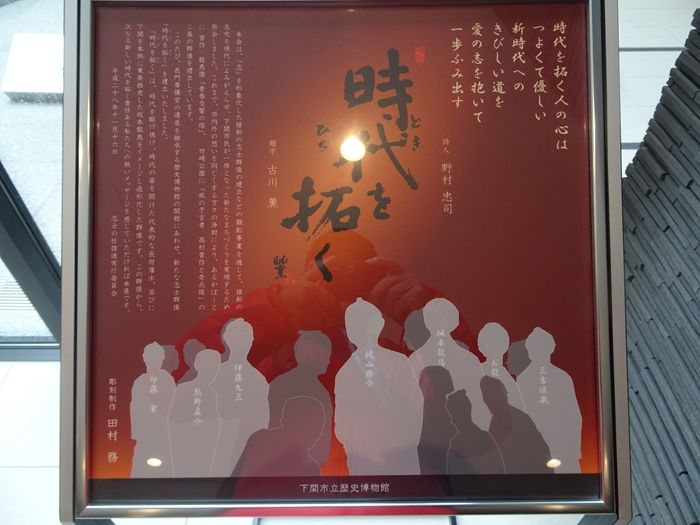 龍馬とお龍をかくまった伊藤九三、長府集童場の創設者、熊野直介ら幕末の志士7人の像。