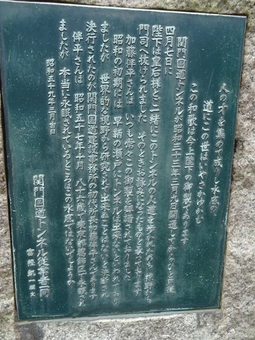 この碑は関門トンネルが開通した1ヵ月後に昭和天皇が関門国道建設事務所の