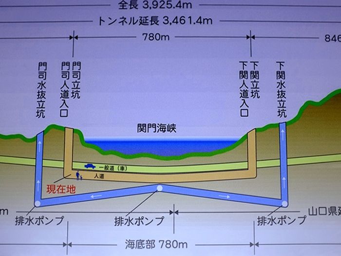 トンネルの中ほどには福岡県と山口県の県境の標識があり、珍しい海底の県境として有名であると。