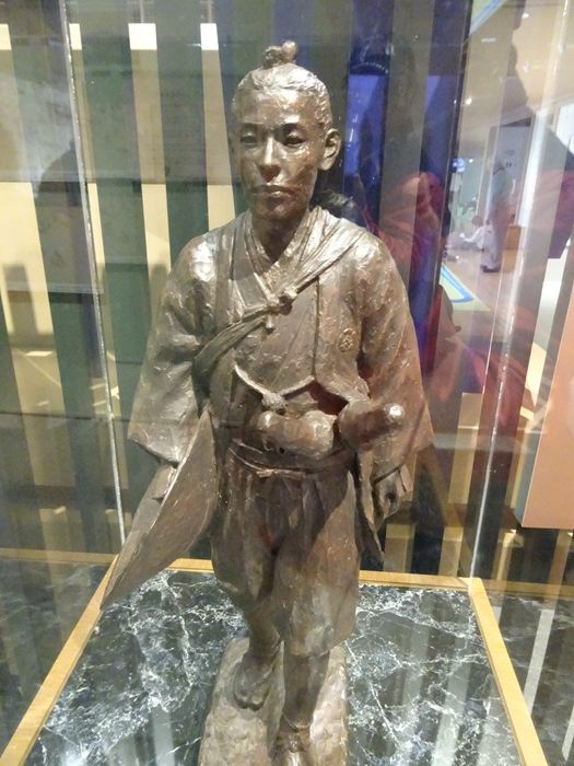 両刀を差した羽織、袴の立ち姿。銅像の高さは1.8mで、台座を含めて3m。