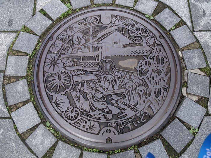 藩校養老館の掘割に泳ぐ錦鯉と満開の菖蒲と町の花ツワブキのデザイン。