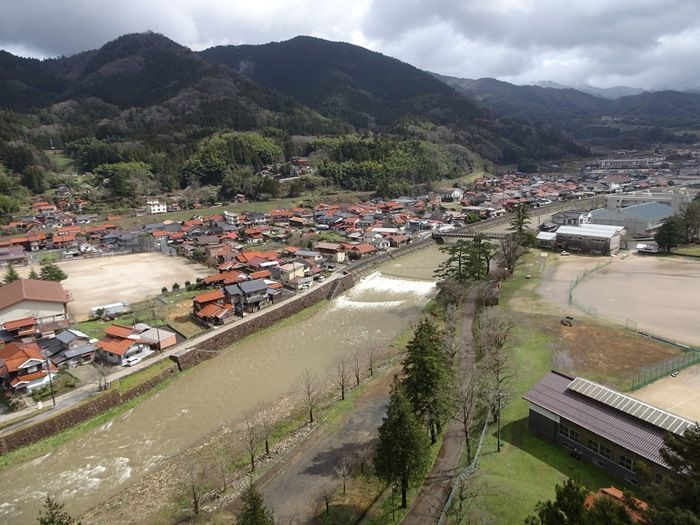 城下町の情緒を残した自然豊かな町。この日は雨の後で濁水が勢いよく流れていた。