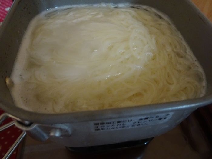旅友Sさんが持参された電気鍋でソーメン・揖保乃糸を茹でる。