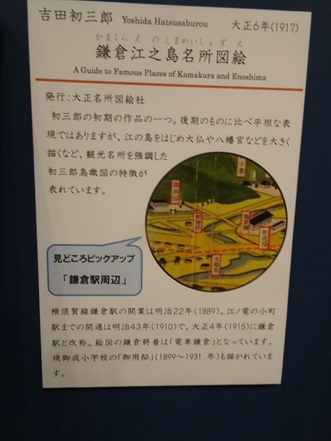大仏や八幡宮などを大きく描くなど、観光名所を強調した初三郎鳥瞰図の特徴が現れています。』