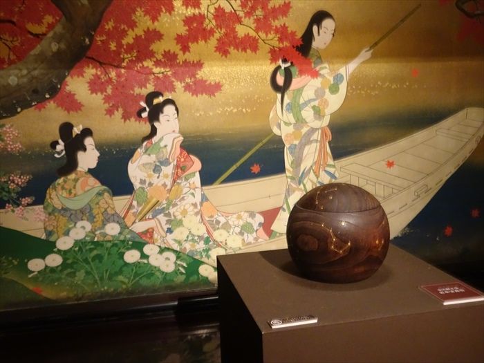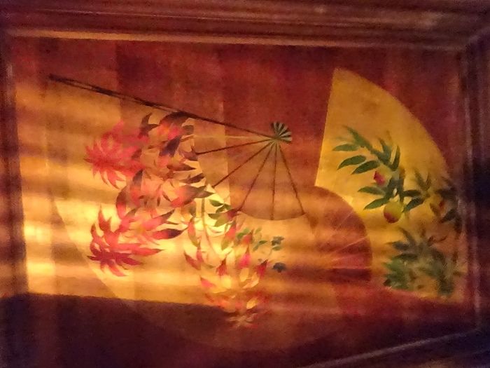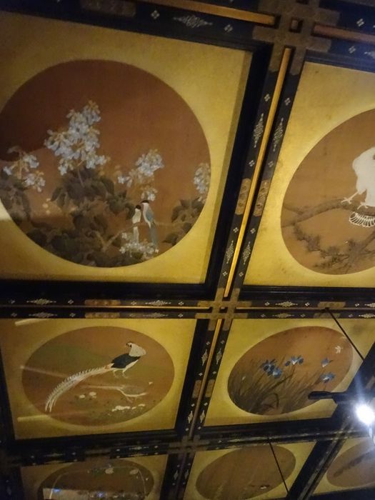 四季の花鳥画が描かれている。 黒漆の螺鈿細工が随所に見られる重厚な造りの部屋。