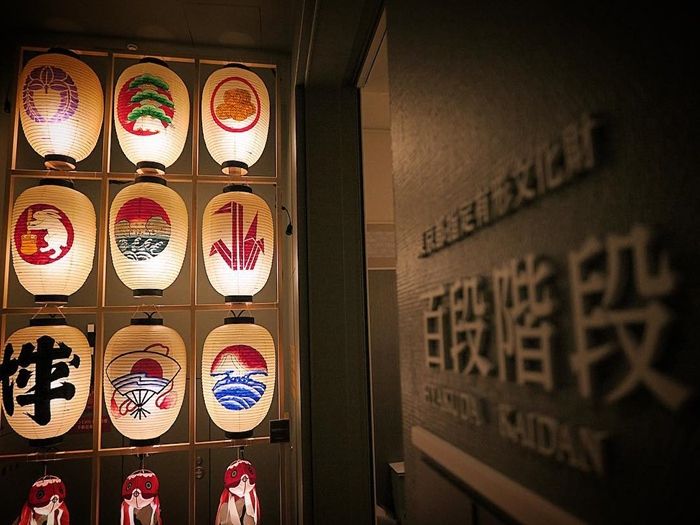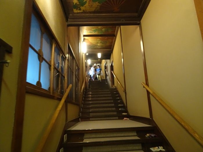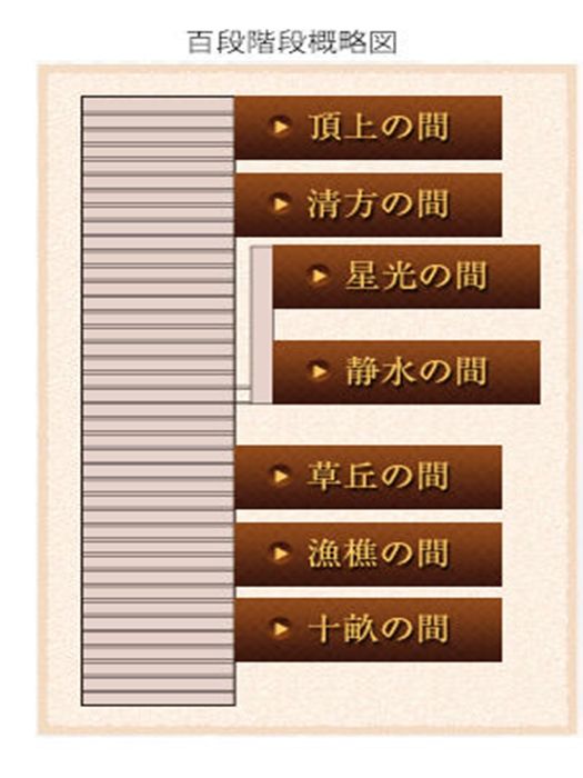 百段階段は、宴席が行なわれた7部屋(畳の部屋)を99段の階段廊下で繋いでいる建物の為、