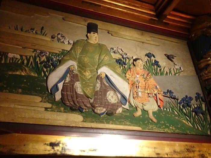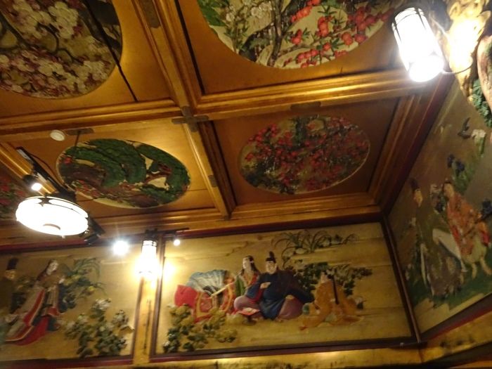格天井には菊池華秋原図の四季草花図、欄間には尾竹竹坡原図の五節句が極彩色に浮彫されている。