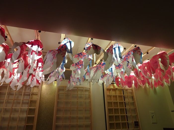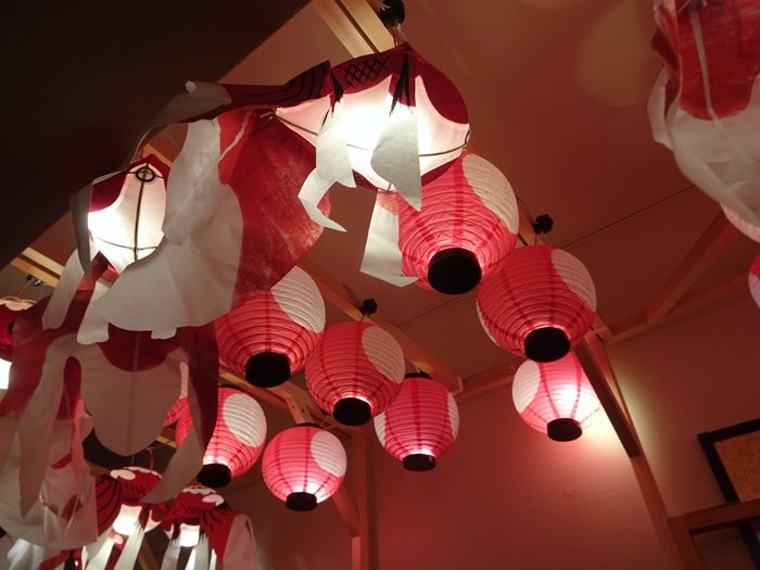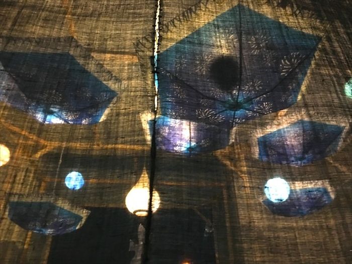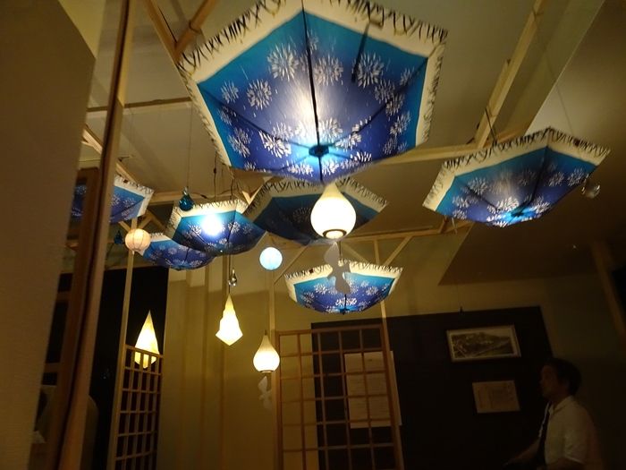 これをくぐると花火やホタルなどが描かれた涼しげな青の日傘の花が天井から開いていた。