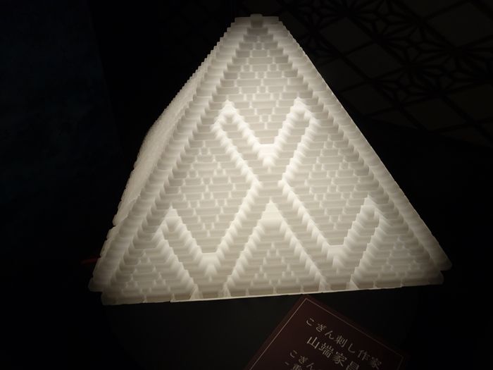 乳白色のアクリル板をこぎん刺し模様の糸の動きを立体彫刻のように組み上げた